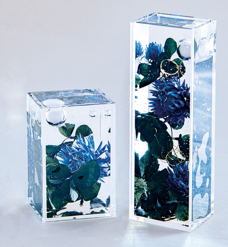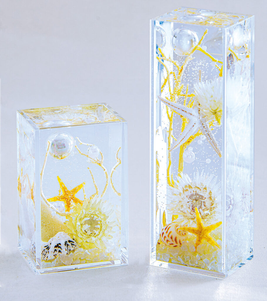 海をイメージしていろいろな海の資材をいれて海が好きだったこと、海によく行ったことなどが思い出されるアイテムです。