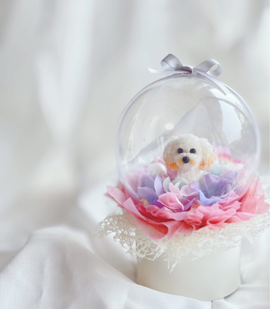 亡くなったペットにそっくりな小さなぬいぐるみを100%オーダーメイドで制作し、虹の橋をイメージしたやわらかな色のお花畑の中に座った供養アイテムです。