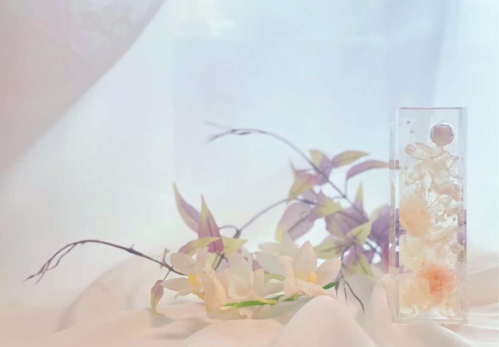 粉骨したお骨をガラス玉に入れて一緒にひとつのアイテムとして供養することができるのでお花が無い時も華やかで上品なモニュメントです。